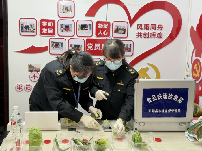 ▲检查人员对学校食品供应商供应的食材进行快检(阳朔县市场监管局供图)